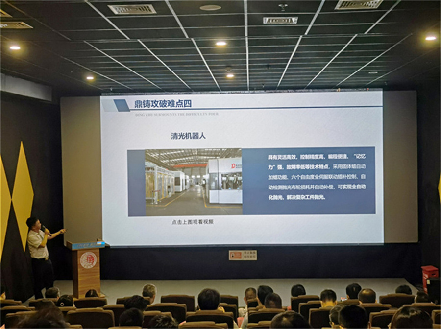 張總監(jiān)介紹到鼎鑄以先進的生產工藝和頂尖的技術力量突破多項鑄造難題,自主研發(fā)創(chuàng)新制造出:低壓鑄造機、清光機器人、數控鋸切機、機器人打磨單元、全自動射芯機、重力澆鑄機等多款智能化設備,能幫助企業(yè)解決傳統(tǒng)鑄造、拋光打磨等難題,助力行業(yè)發(fā)展。